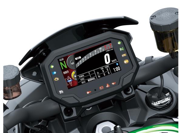 The Z H2’s advanced electronics package includes numerous electronic control systems such as KTRC, KCMF, and KIBS, as well as an IMU that provides chassis orientation feedback to KIBS and KTRC. These rider-support systems offer the peace of mind to handle the power of the supercharged engine, while providing a wide range of information. In addition, Electronic Cruise Control and KQS further enhance riding convenience. In addition, a choice of three Power Modes, and integrated Riding Modes that link KTRC and Power Mode are extremely easy to operate, allowing riders to focus on their ride.