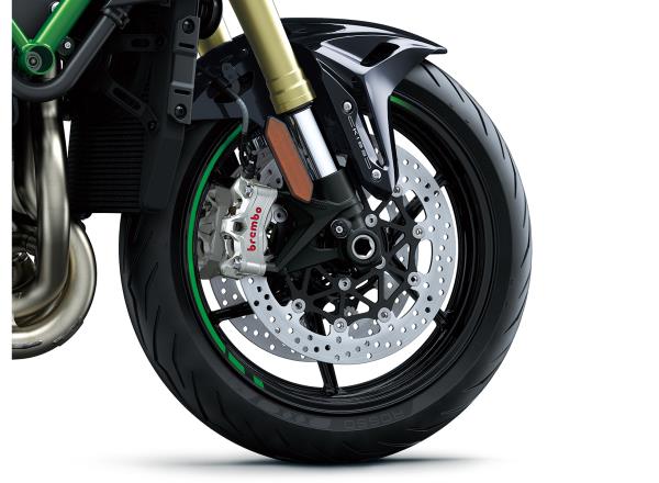 To be easy to ride at low and medium speeds, as well as high speeds, the Z H2 needed a brake system that matches its performance. The front brakes are gripped by Brembo M4.32 monobloc calipers. Machined from cast aluminium blocks, their highly rigid one-piece structures boast strong braking force. The calipers are radially mounted, further contributing to their high performance. The Nissin master cylinder, fine-tuned with Kawasaki original settings, offers functionality perfectly matched to the Z H2’s character, enabling riders to not only control deceleration from various speed ranges, but also to use the brakes to initiate weight transfer to change the bike’s posture on corner entry.